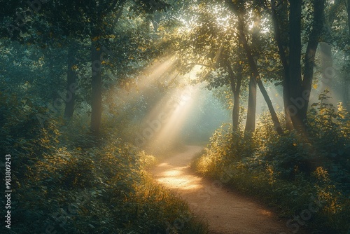 © Outkast, Obraz premium Sunbeams Illuminating a Forest Path