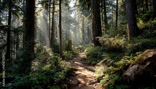Obraz premium Sunbeams illuminating a forest trail