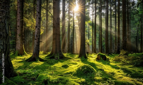 © Lem, Fototapeta premium Sunbeams Illuminating a Lush Forest Floor.