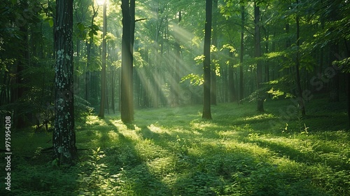 Obraz premium Sunbeams Illuminating a Lush Forest Floor