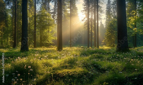 © ngamaz, Naklejka premium Sunbeams illuminating a lush forest floor covered in wildflowers.