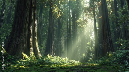 © chesleatsz, Obraz premium Sunbeams Illuminating a Lush Forest Path