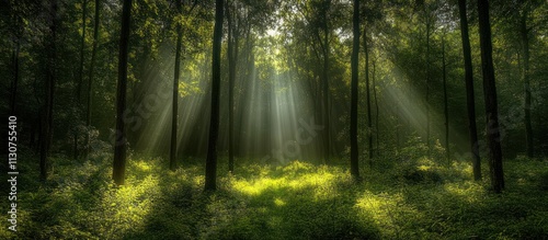 © Almahyra, Fototapeta premium Sunbeams illuminating a lush green forest floor.