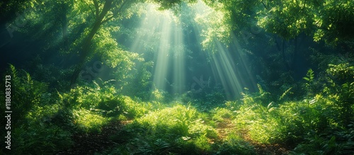 Fototapeta premium Sunbeams illuminating a lush green forest with dense foliage and a pathway...