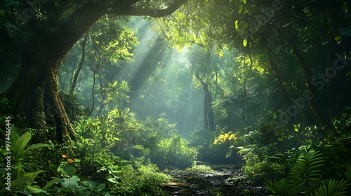 © sungedi, Obraz premium Sunbeams Illuminating a Lush Rainforest Path