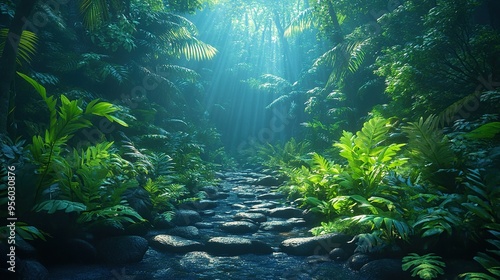 © ali, Fototapeta premium Sunbeams Illuminating a Lush, Tropical Stream
