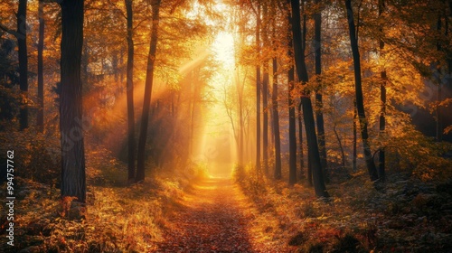 Fototapeta premium Sunbeams Illuminating a Misty Autumn Forest Path