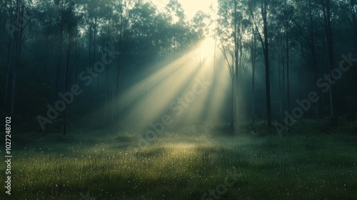 Fototapeta premium Sunbeams Illuminating a Misty Forest Clearing