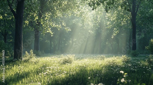 Obraz premium Sunbeams Illuminating a Misty Forest Clearing