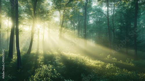 © Koplexs-Stock, Fototapeta premium Sunbeams Illuminating a Misty Forest Clearing