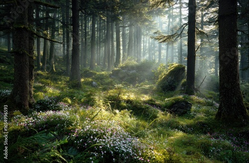 © Wawan, Obraz premium Sunbeams illuminating a misty forest floor carpeted in wildflowers