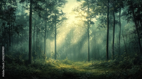 © novian, Naklejka premium Sunbeams Illuminating a Misty Forest Path