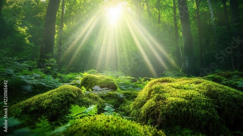 © meta, Fototapeta premium Sunbeams Illuminating a Mossy Forest Floor