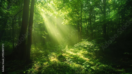 Obraz premium Sunbeams Illuminating a Mystical Forest