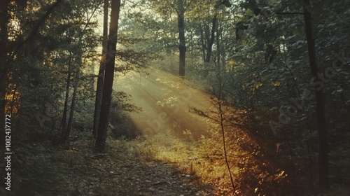 Obraz premium Sunbeams Illuminating a Mystical Forest Path