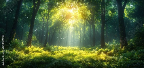 © Muamanah, Obraz premium Sunbeams Illuminating a Mystical Forest Path