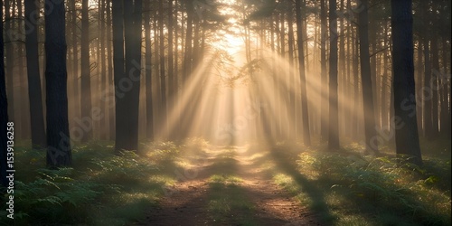 Obraz premium Sunbeams Illuminating a Mystical Forest Path A Serene Nature Photography
