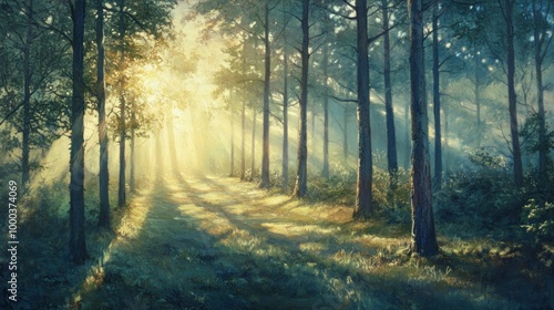 © Rere_Art151, Obraz premium Sunbeams illuminating a path through a dense forest