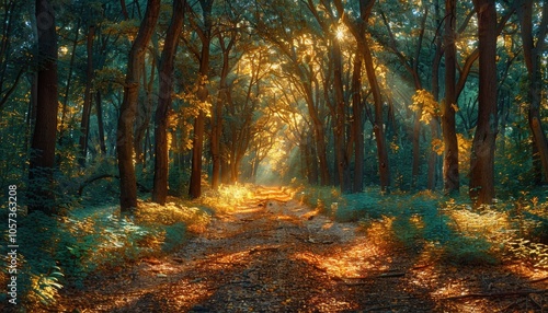 © boler, Obraz premium Sunbeams Illuminating a Path Through a Dense Forest