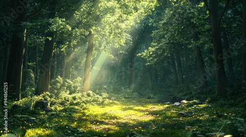 © Penatic Studio, Obraz premium Sunbeams illuminating a path through a dense, verdant forest