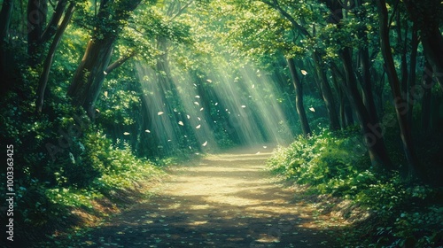 Fototapeta premium Sunbeams Illuminating a Path Through a Lush Green Forest