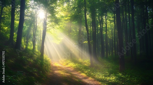Obraz premium Sunbeams Illuminating a Path Through a Misty Forest