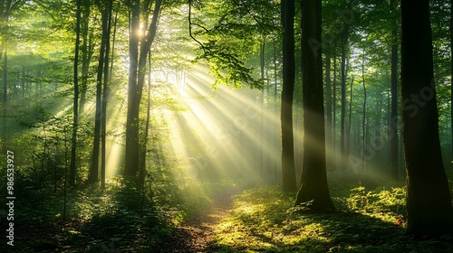 Obraz premium Sunbeams Illuminating a Path Through a Misty Forest