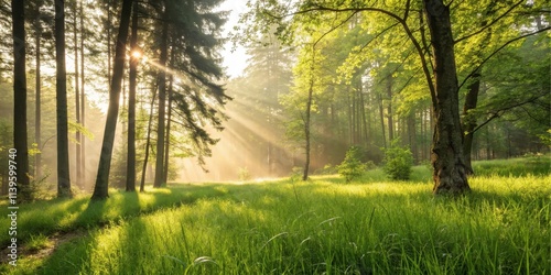 © Theerawat, Naklejka premium Sunbeams illuminating a tranquil forest clearing, dappled sunlight filtering through leaves onto lush green grass