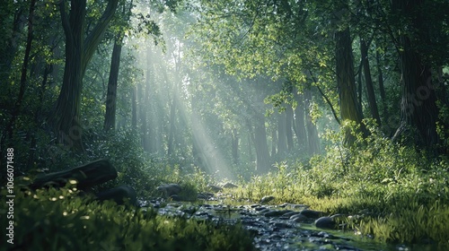 Obraz premium Sunbeams illuminating a tranquil forest stream