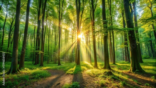 Obraz premium Sunbeams illuminating a verdant forest path at dawn