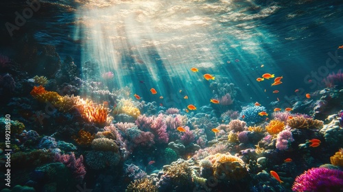 Naklejka premium Sunbeams Illuminating a Vibrant Coral Reef