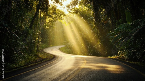 Fototapeta premium Sunbeams Illuminating a Winding Road Through Lush Tropical Forest