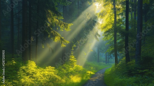 © Loopik, Obraz premium Sunbeams illuminating forest path in lush green woodland