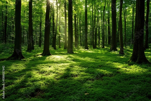 © Lubos Chlubny, Obraz premium Sunbeams illuminating lush green forest floor covered in moss and plants
