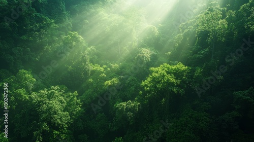 © Mulyadi Lim, Fototapeta premium Sunbeams Illuminating Lush Rainforest Canopy