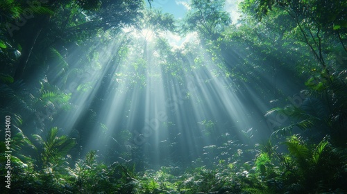 © Muamanah, Fototapeta premium Sunbeams Illuminating Lush Rainforest Canopy