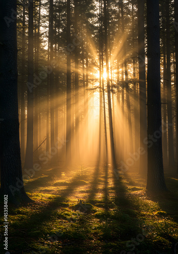 © Janos, Obraz premium Sunbeams illuminating misty coniferous forest at sunrise, creating magical atmosphere.