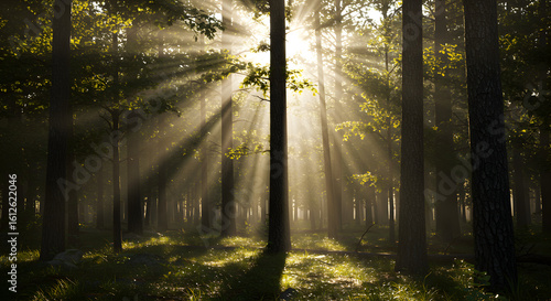 © mest selda blessun, Fototapeta premium Sunbeams Illuminating Misty Forest Path