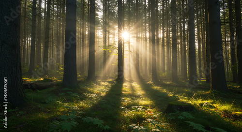 Fototapeta premium Sunbeams Illuminating Misty Pine Forest Floor