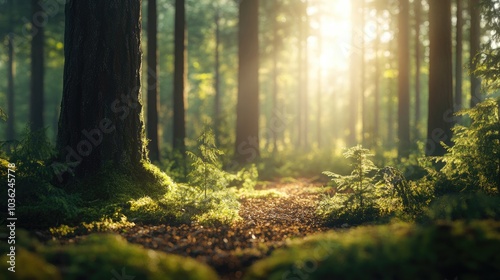 Obraz premium Sunbeams illuminating moss covered forest floor