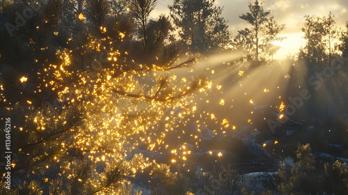 © StudioX, Naklejka premium Sunbeams illuminating snow-covered pine tree branches at sunset.