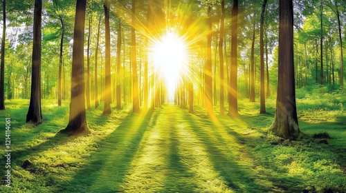 © Ilja, Naklejka premium Sunbeams Illuminating Tranquil Forest Path, Serene Woodland Scene with Golden Sunlight