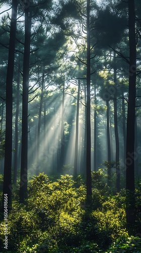 Obraz premium Sunbeams in a dense green forest.