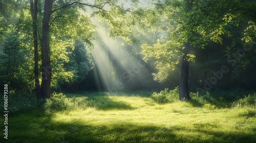 © atar, Fototapeta premium Sunbeams in a Green Forest