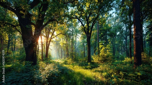 © Busuk, Obraz premium Sunbeams in a lush forest
