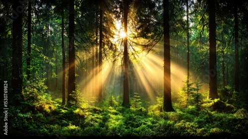 Fototapeta premium Sunbeams in a Lush Green Forest Tranquil Morning Sunlight Through Trees