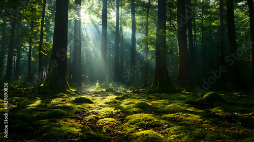 Obraz premium Sunbeams in a Magical Forest: Serene Nature Photography