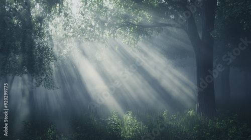 © BerkahStock, Obraz premium Sunbeams in a Misty Forest