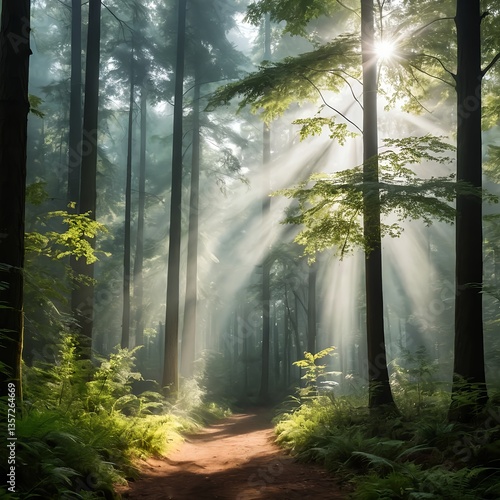 Fototapeta premium Sunbeams in a Misty Forest Path
