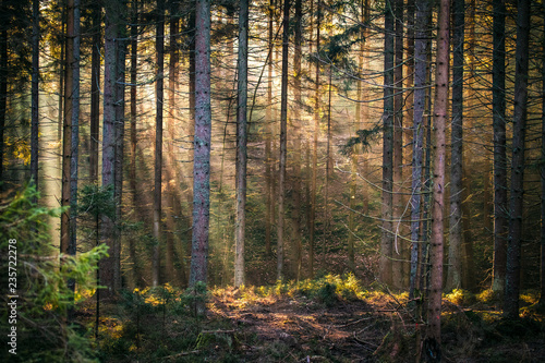 Fototapeta premium Sunbeams in forest morning